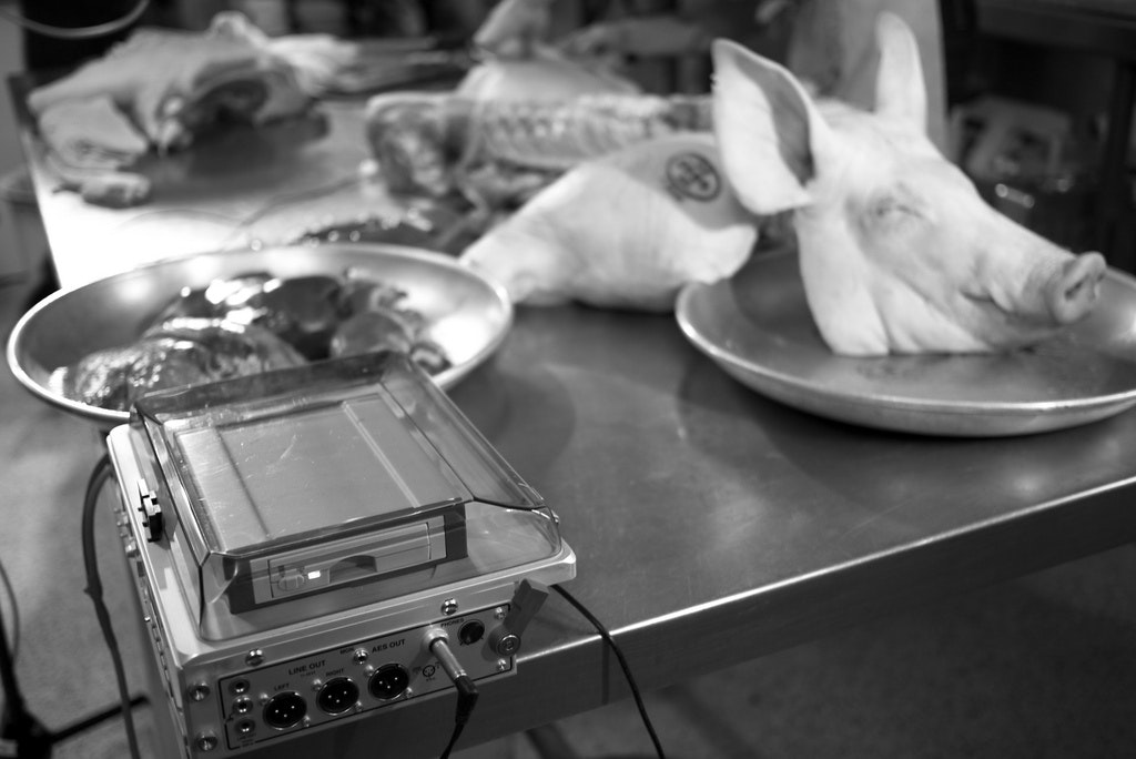 And so to the swine. Recording all the key stages of a pig from its birth to its death at twenty-four weeks, Herbert’s made an experimental album that operates between the polarities of stark, unprocessed grunts all the way to primal, melancholic techno. Pigs are used in many products humans are obsessed with, from bullets, film, beer and onto make-up and cigarettes. One of the producer’s main aims was that every single part of the animal was used. No waste. So he assembled a team of specialists to butcher, process, cook, then eat the animal over a banquet that maintained every possible respect for the animal’s life and historical use. All the while Herbert captured every noise he could.