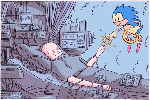 The plan worked. I loved my Mega Drive. I loved Sonic and his perpetual energy. This gaming obsession warmed my sepia hospital room like a sunrise. Regardless of what exotic brew of chemotherapy they dosed me with, or whether I lay in my home bed or a medical bed, the only true constant in my life was that hyperactive hedgehog's defiant smile and spinning red sneakers. As I boisterously hammered the controller, all thumbs and mutters, the chemo needle wiggled painfully in my forearm. Like a spur in a horse's flank, each noxious twinge hurled me further into a pixelated world of escape.